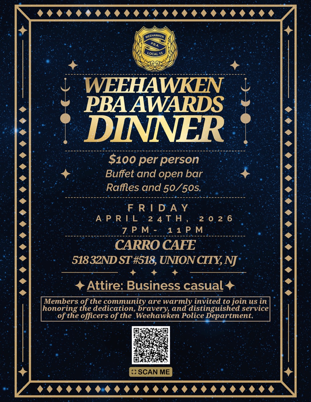 The Weehawken Policemen’s Benevolent Association Local 15 will host its annual PBA Awards Dinner on Friday, April 24, 2026, at Carro Cafe in Union City, New Jersey.